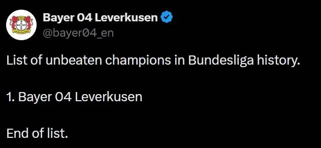 与此同时,勒沃库森官方社媒发文庆祝,“德甲历史上的不败冠军名单:1. 勒沃库森。名单结束。”